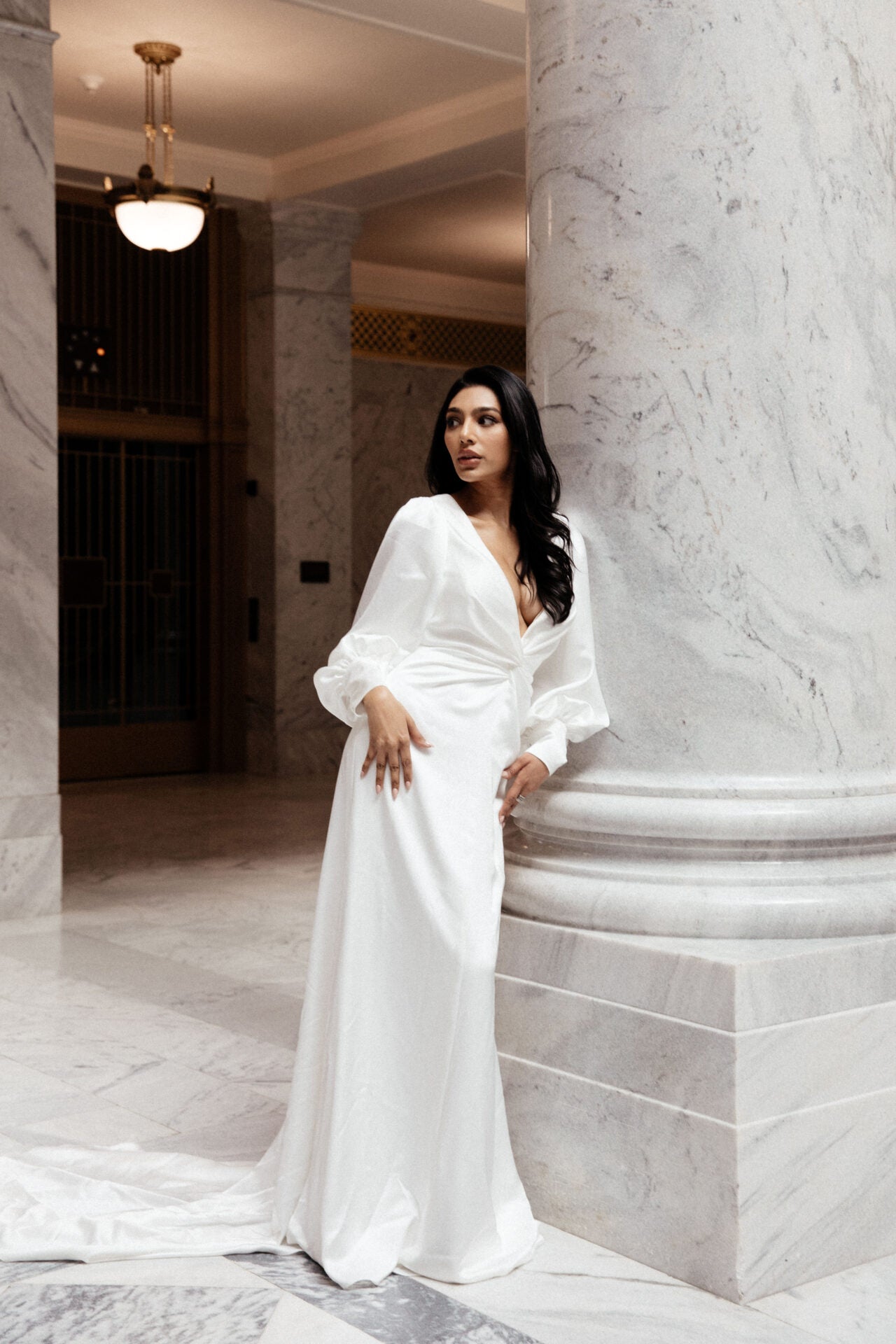 Style 1646 from the Martina Liana collection radiates couture chic with its charmeuse construction and exquisite designer details. This sophisticated and daring design has long blouson sleeves, a deep plunging V-neckline, ruched waist and striking low V-back, creating a luxuriously contoured silhouette. Skimming every curve with chiffon, this minimalist yet boho-inspired wedding gown is complete with a sweeping train and optional leg slit, creating an unforgettable statement for the modern bride.