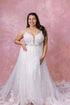 Look and feel your best on your special day with this stunning plus size wedding dress from Martina Liana, style 1137. Elegant beaded shoestring straps, a plunging neckline and sheer bodice, and beautiful vine-like and floral patterns come together to create a truly breathtaking look. The relaxed A-line silhouette with a fitted sparkly lining is highlighted with carefully placed lace appliqués, creating an ethereal and romantic look. Make a statement with the effortless glamour of this unique dress.