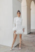 Introducing Clara: the ultimate mini dress for those who appreciate sleek, sexy, and flirty style. Crafted from a luxurious crepe blend, this dress is designed to make you look and feel amazing. Adorned with feather trims, a pearl collar, and built-in cup support, it's a true stunner. Complete with a zipper closure and hook and eye fastening. Experience the after party like no other.