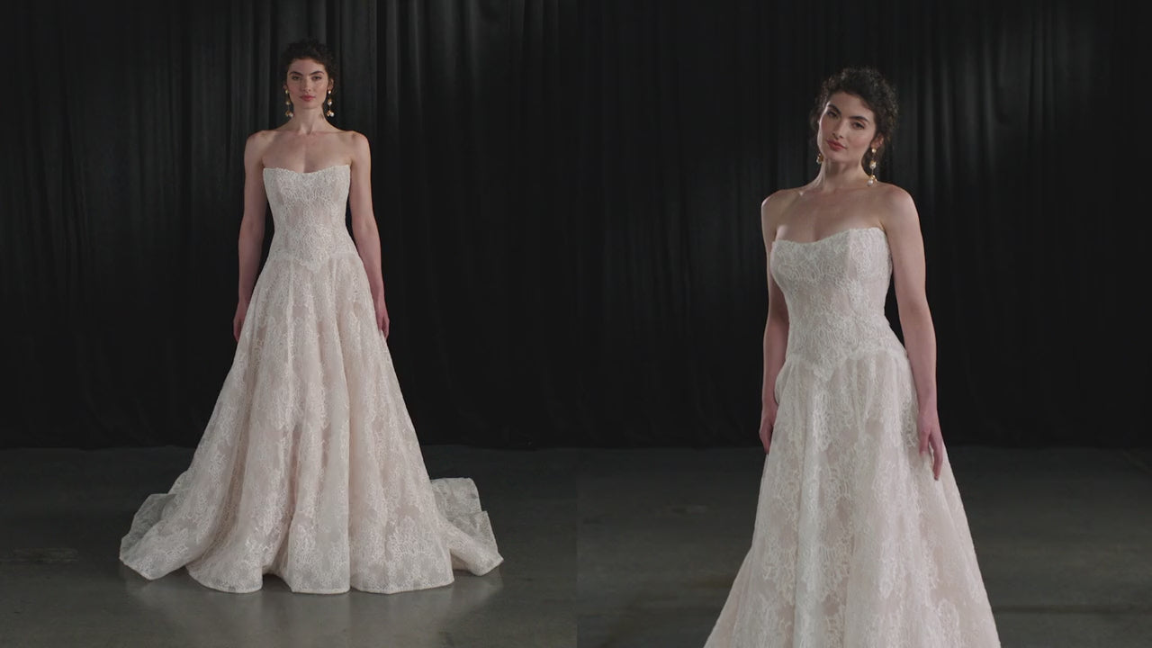 ML1963 is delicate by design, its slim A-line silhouette cut entirely from fine and delicate lace. The fabric is light and airy, almost weightless, but carries a quiet richness in its intricate patterning. At the bodice, a pointed sweetheart neckline gives structure to the strapless shape, balancing softness with subtle edge. The waistline drops low into a slight basque point, elongating the figure before the skirt falls away in effortless movement. Down the back, a row of pearl buttons continues all the way to the hem, a detail that feels both timeless and meticulously considered. Brides can choose between a clean zip closure or a sheer tulle lace-up corset for a more romantic finish.