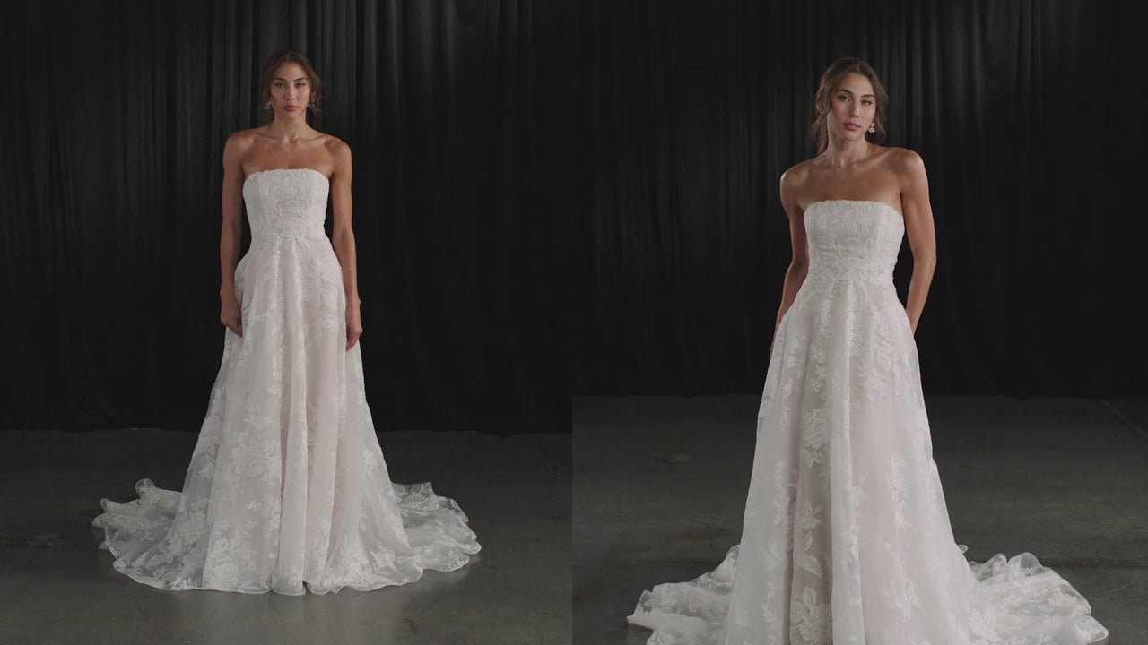 ML1996 by Martina Liana layers romance and refinement into a slim A-line silhouette. The strapless straight neckline feels clean and modern, letting the fabric and texture do the talking. Large-scale floral lace motifs bloom across a layer of airy organza, softened by tulle that adds depth and lightness. Beneath, brides can choose between a classic ivory lining or a soft biscotti tone that brings a subtle blush warmth. The skirt is designed with a slimmer cut than a traditional A-line, offering movement and grace without overwhelming volume. Every element works together to create a gown that is both airy and striking, with lace that seems to float across the body.