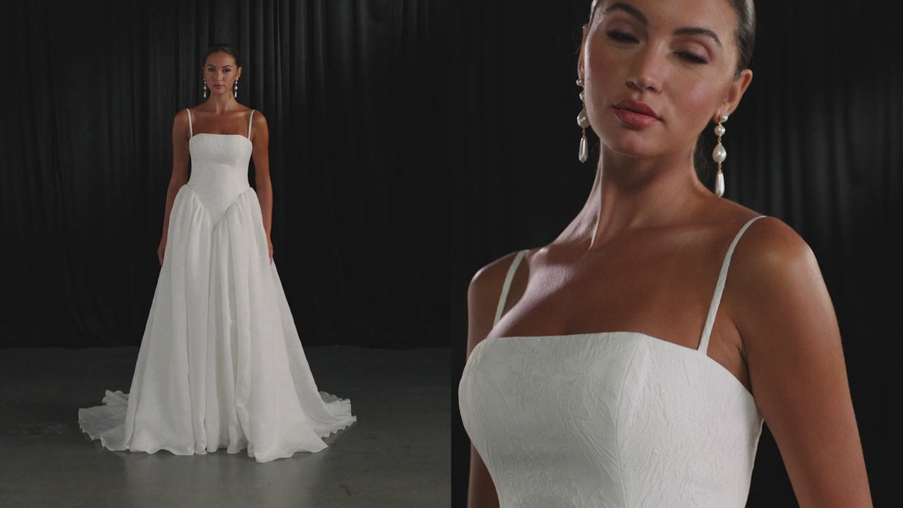 ML1998 is sculpted in luminous Organdy Jacquard, a fabric that catches light with subtle texture and sheen. The square neckline feels sharp and modern, softened by delicate spaghetti straps that frame the shoulders with ease. At the waist, a classic basque cut elongates the torso before giving way to the skirt. Pleated ruching at the hips adds volume and movement to the A-line shape without losing its clean lines. The result is architectural yet romantic, a gown that feels both timeless and refreshingly new.