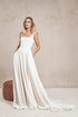 Discover the elegance and luxury of the Mya wedding dress by Vagabond. Featuring a contemporary square neckline and backline, reinforced bodice, and full a-line crepe skirt with pockets. This dress is perfect for the modern bride looking for comfort and sophistication. With its minimalistic design, Mya requires very little and leaves a lasting impression.