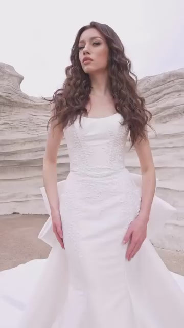 Talia by Dany Tabet is unapologetically elegant, blending classic restraint with couture drama. The strapless bateau neckline sits clean and architectural across the décolletage, setting the tone for a silhouette that is sleek, sculpted, and precise. Cut in structured mikado, the fitted shape traces the body with confidence, elevated by custom hand beading that adds quiet sparkle and dimension. At the back, a matching stacked bow train introduces a moment of artistry, transforming the gown from refined to unforgettable.